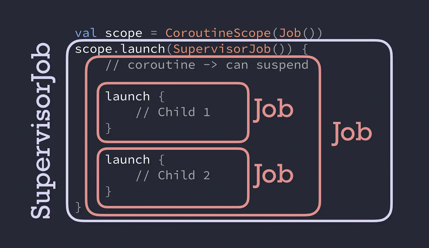 警告:SupervisorJob只有在以下两种作用域中才会起作用:使用supervisorScope{...}或CoroutineScope(SupervisorJob())创建的作用域