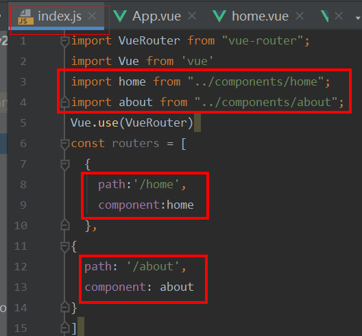 - 然后在index.js里导入home.vue about.vue