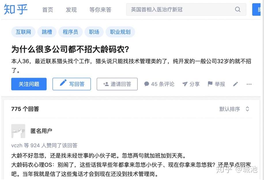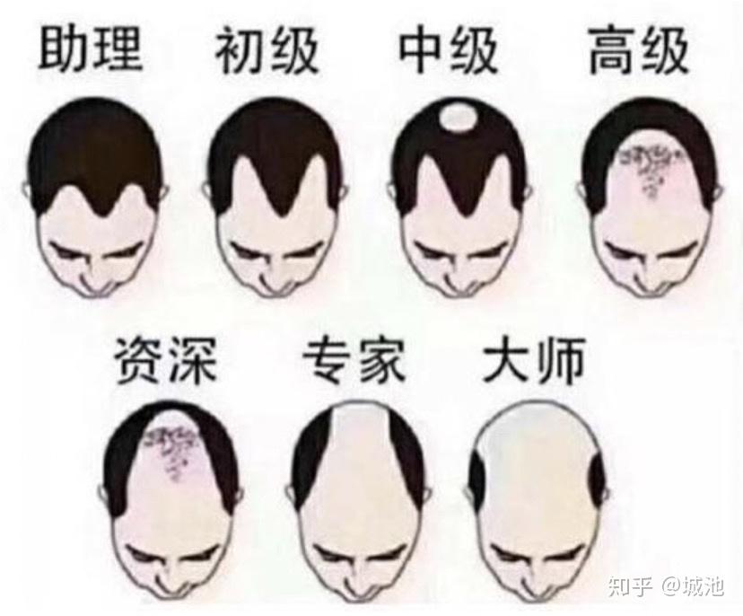 不过我的头发还是很好哈,这可能是遗传的原因。从图里可以看到中级就开始秃顶了,好悲惨。但是更惨的是我们可能还没到资深,头发还没秃多少的时候,我们已经35岁了,已经开始迷惘了。往上流传着各种30、35岁大龄码农找不到工作开始开始迷茫的case,比如知乎上随便一搜就能看到这种赤裸裸的年龄歧视