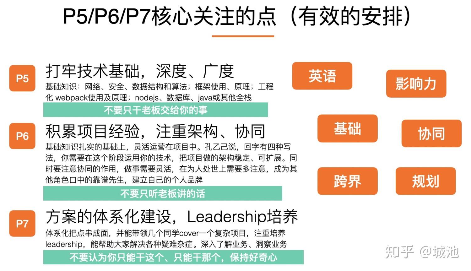 - P6:基础知识打好,在项目中可以尽可能的使用。考虑项目风险的情况下,尽可能的尝试用不同的方式、不同的架构去实现同一个需求,尽量让你扎实的基础能发挥出来。另外不要只听老板讲的话,要知道这话背后的含义。尽可能的多做,也开始需要了解项目背后的原因,多跟其他协同角色沟通,帮助其他角色一起完成项目方案,拿到一个好的结果。不要怕麻烦,多帮助其他角色,成为其他人口中的靠谱先生,建立自己的个人品牌。