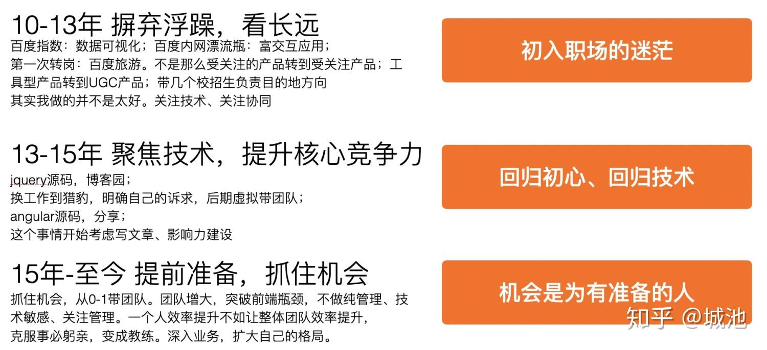 大家好,我是阿里云业务中台前端团队的城池,目前负责阿里云核心的官网、营销、售卖、商业化、销售等整个端到端业务流程。今天的主题是:如何做职业规划,当拿到这个主题的时候还是比较虚的,有点类似讲成功学。本身也不觉得自己做的有多好,只不过是趟的坑比较多。今天会花一点时间给大家分享一下我过去的一些经验。先看下我过去的职场经历: