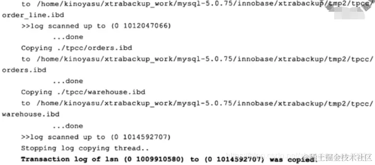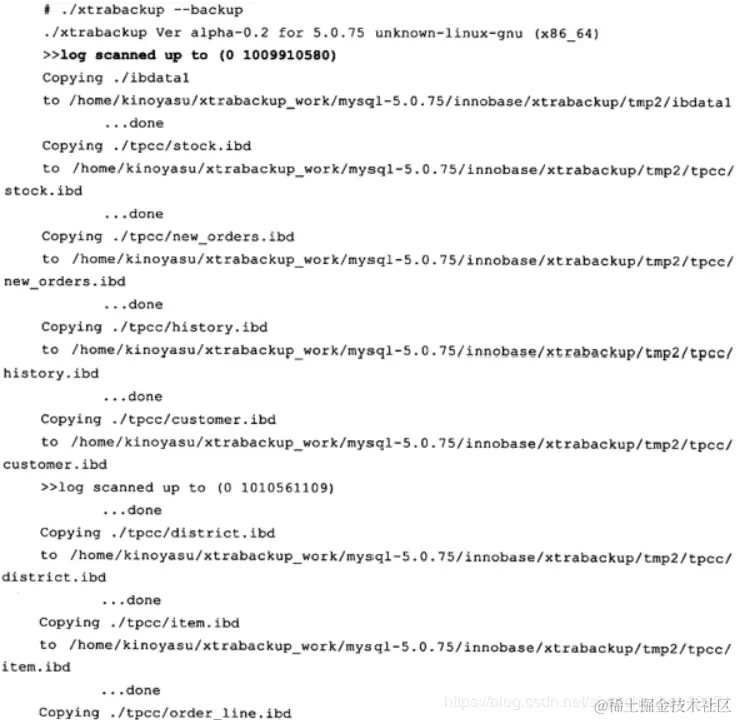 可以看到在开始备份时, xtrabackup首先记录了重做日志的位置,在上述示例中为(0 1009910580)。然后对备份的 InnoDB存储引擎表的物理文件,即共享表空间和独立表空间进行copy操作,这里可以看到输出有 Copying…to…。最后记录备份完成后的重做日志位置(0 1014592707)。