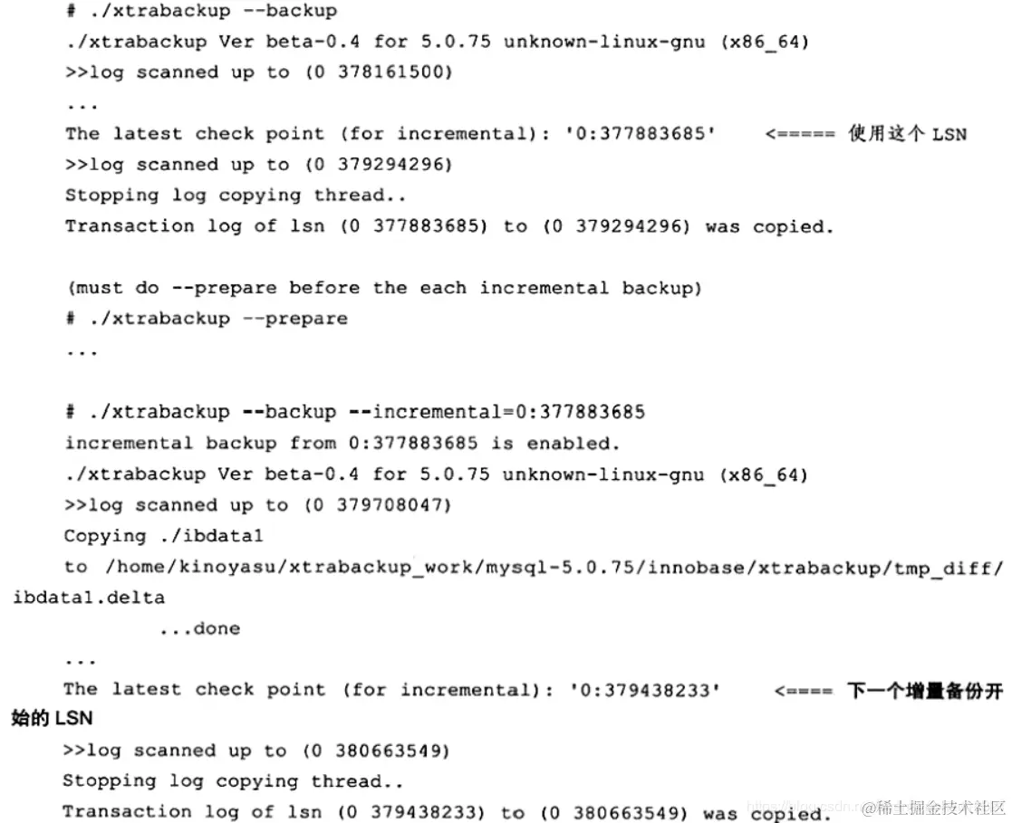在上述过程中,首先将全部文件备份到/backup/base目录下,增量备份产生的文件备份到/backup/delta。在恢复过程中,首先指定全备的路径,然后将增量的备份应用于该完全备份。以下显示了一个完整的增量备份过程: