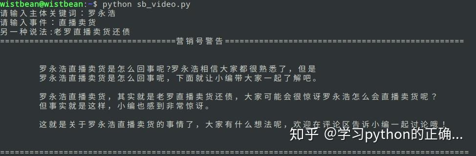 是不是老小编了?但是这样还不够好玩,我们直接用 Python 整成一个彻底的营销号视频,把生成的营销文案转为语音,通过主体关键词去网上扒一些相关的图片,再把它们合成视频输出,那才叫一个酸爽啊。