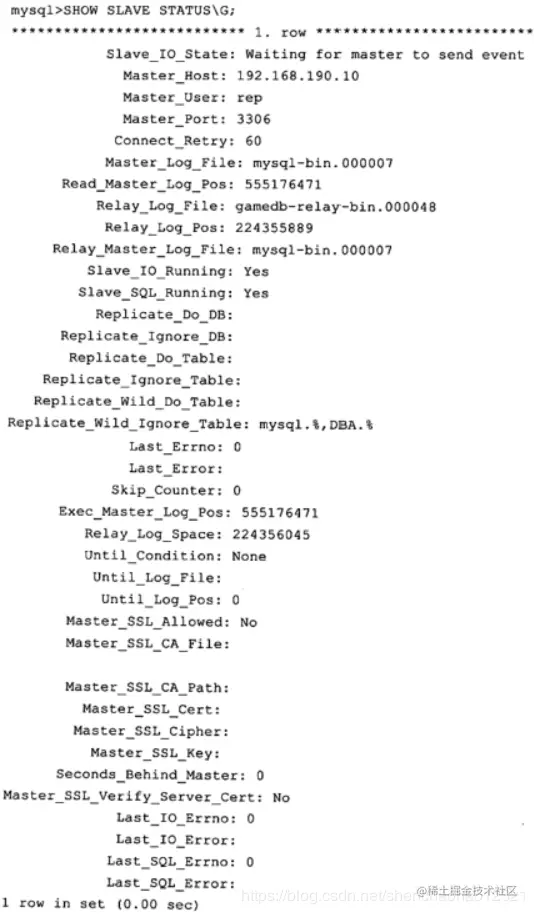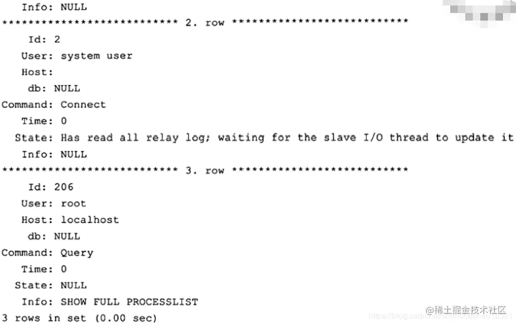 可以看到ID为1的线程就是IO线程,目前的状态是等待主服务器发送二进制日志。ID为2的线程是SQL线程,负责读取中继日志并执行。目前的状态是已读取所有的中继日志,等待中继日志被IO线程更新。