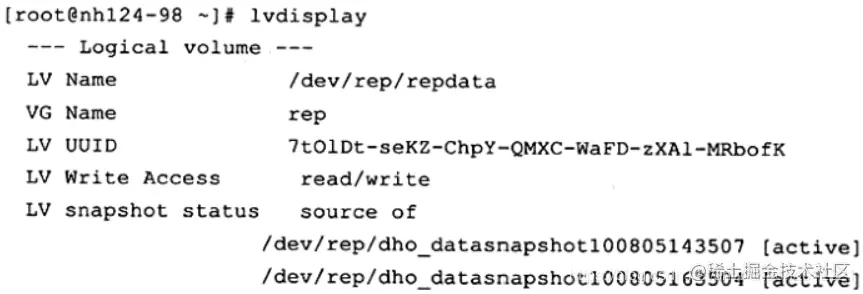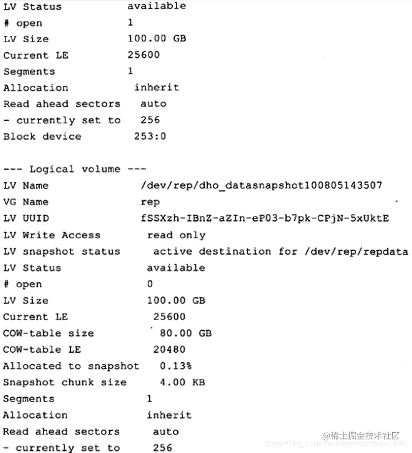 可以看到,一共有3个逻辑卷,都属于卷组rep,每个逻辑卷的大小都是100GB。dev/rep/repdata这个逻辑卷有两个只读快照,并且当前都是激活状态的。