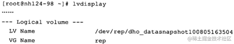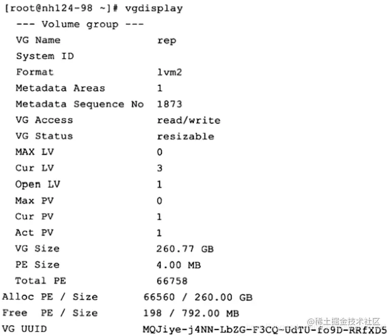 vgdisplay命令的输出结果显示当前系统有一个rep的卷组,大小为260.77GB,该卷组访问权限是 read/write等。命令lvdisplay可以用来查看当前系统中有哪些逻辑卷: