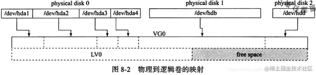 图8-2显示了由多块磁盘组成的逻辑卷LV0。