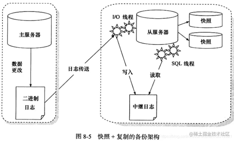 因此,一个比较好的方法是通过对从服务器上的数据库所在分区做快照,以此来避免误操作对复制造成影响。当发生主服务器上的误操作时,只需要将从服务器上的快照进行恢复,然后再根据二进制日志进行point-in-time的恢复即可。因此快照+复制的备份架构如图8-5所示。
