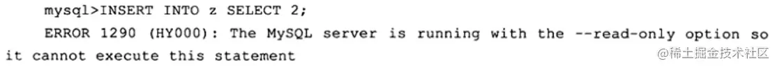 在启用read-only选项后,如果操作从服务器的用户没有 SUPER权限,则对从服务器进行任何的修改操作会抛出一个错误,如: