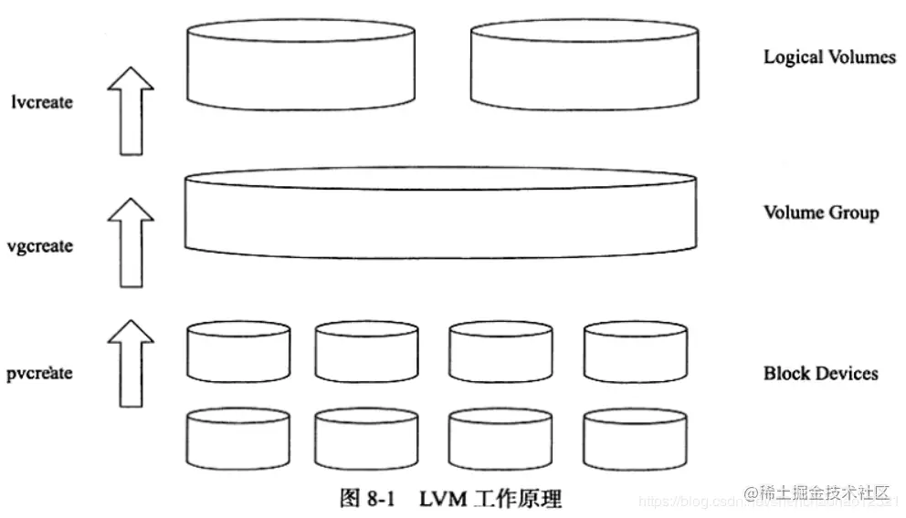 LVM是 LINUX系统下对磁盘分区进行管理的一种机制。LVM在硬盘和分区之上建立一个逻辑层,来提高磁盘分区管理的灵活性。管理员可以通过IⅥM系统轻松管理磁盘分区,例如,将若干个磁盘分区连接为一个整块的卷组( Volume Group),形成一个存储池。管理员可以在卷组上随意创建逻辑卷( Logical Volumes),并进一步在逻辑卷上创建文件系统。管理员通过LVM可以方便地调整卷组的大小,并且可以对磁盘存储按照组的方式进行命名、管理和分配。简单地说,用户可以通过LVM由物理块设备(如硬盘等)创建物理卷,由一个或多个物理卷创建卷组,最后从卷组中创建任意个逻辑卷(不超过卷组大小),如图8-1所示