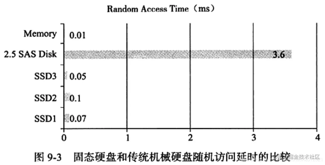 由于闪存是一个完全的电子设备,没有读写磁头等移动部件,因此固态硬盘有着较低的访问延时。当主机发布一个读写请求时,固态硬盘的控制器会把IO命令从逻辑地址映射成实际的物理地址,写操作还需要修改相应的映射表信息。算上这些额外的开销,固态硬盘的访问延时一般小于0.1ms左右。图9-3显示了传统机械硬盘、 内存、固态硬盘的随机访问延时之间的比较。