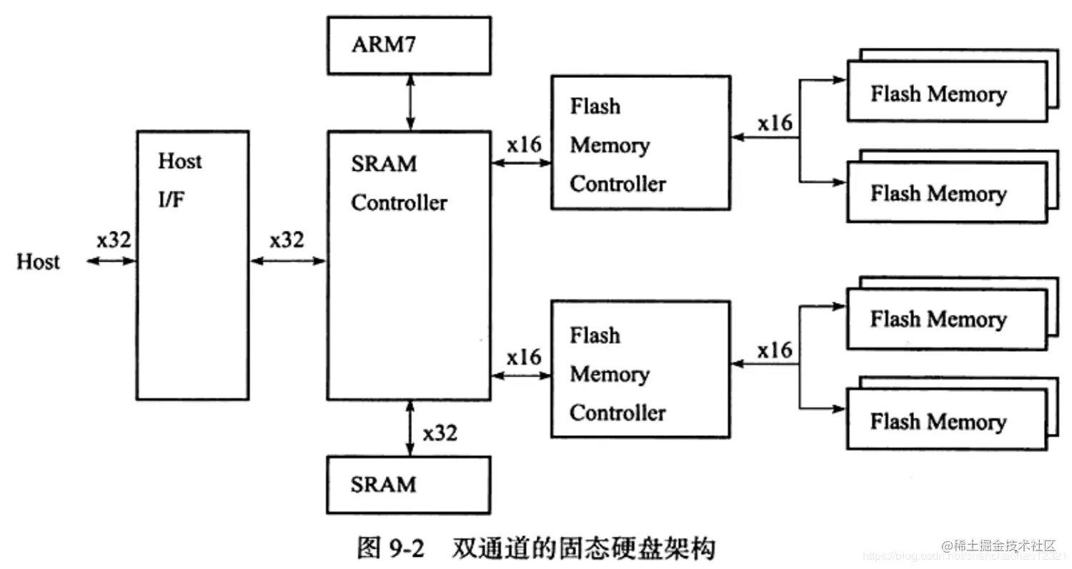 图9-2显示了一个双通道的固态硬盘架构,通过支持4路的闪存交叉存储来降低固态硬盘的访问延时,同时增大并发的读写操作。通过进一步增加通道的数量,固态硬盘的性能可以线性地提高,例如我们常见的 Intel X25M固态硬盘就是10通道的固态硬盘。