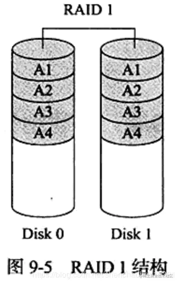 RAD1:两组以上的N个磁盘相互作为镜像(如图9-5所示),图9-4RAID0结构在一些多线程操作系统中能有很好的读取速度,但写入速度略有降低。除非拥有相同数据的主磁盘与镜像同时损坏,否则只要一个磁盘正常即可维持运作,可靠性最高。RAID1就是镜像,其原理为在主硬盘上存放数据的同时也在镜像硬盘上写相同的数据。当主硬盘(物理〕损坏时,镜像硬盘则代替主硬盘的工作。因为有镜像硬盘做数据备份,所以RAID1的数据安全性在所有的RAID级别上来说是最好的。但是,无论用多少磁盘作为RAID1,仅算一个磁盘的容量,是所有RAID中磁盘利用率最低的一个级别。