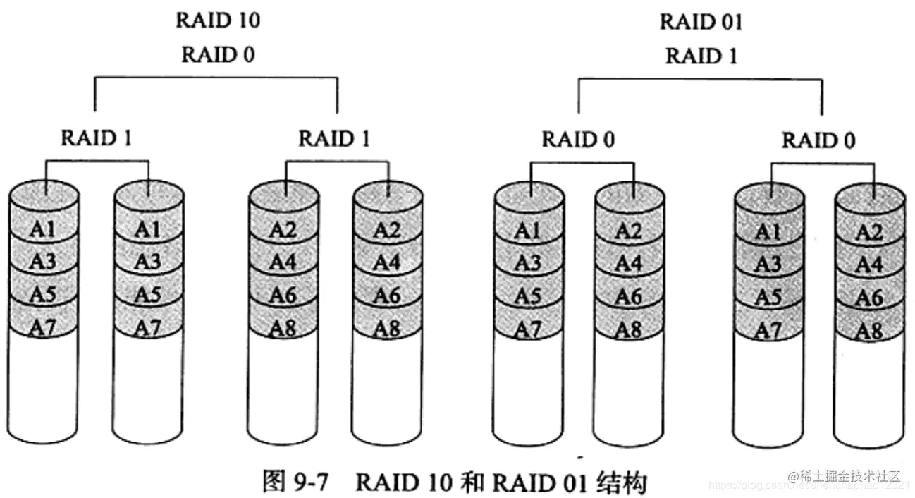 RAID10和RAD01:RAID10是先镜像再分区数据,将所有硬盘分为两组,视为RAID0的最低组合,然后将这两组各自视为RAID1运作。