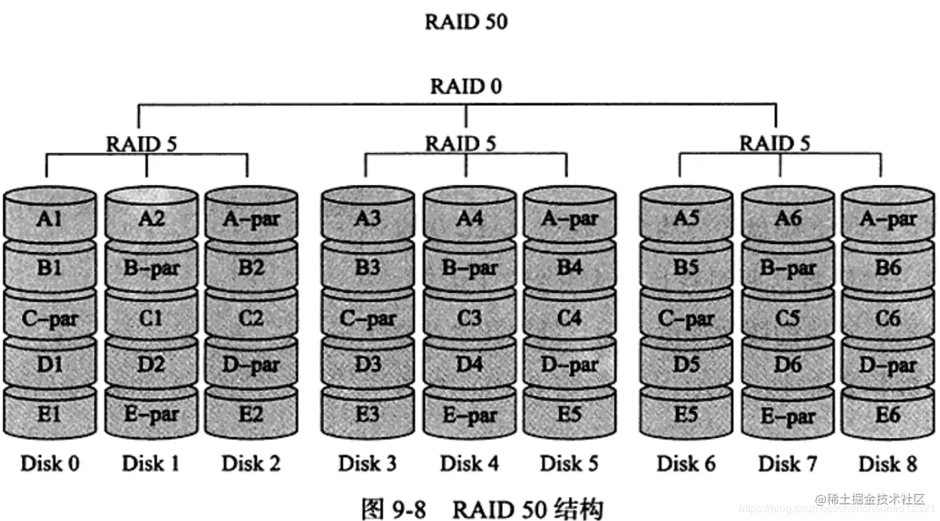 RAD50:RAID50也被称为镜像阵列条带,由至少六块硬盘组成,像RAID0样,数据被分区成条带,在同一时间内向多块磁盘写人;像RAID5一样,也是以数据的校验位来保证数据的安全,且校验条带均匀分布在各个磁盘上,其目的在于提高RAID5的读写性能。