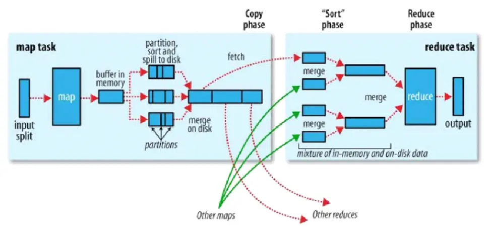 ② 有一个minSpillsForCombine(配置项是"mapreduce.map.combine.minspills",默认为3)的参数。map输出结束后,当溢写次数≥这个参数时,会将多次溢写的小文件合并成一个大文件(避免小文件的碎片化对未来reduce拉取数据造成的随机读写)期间,也会出发combiner。