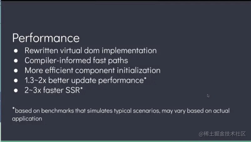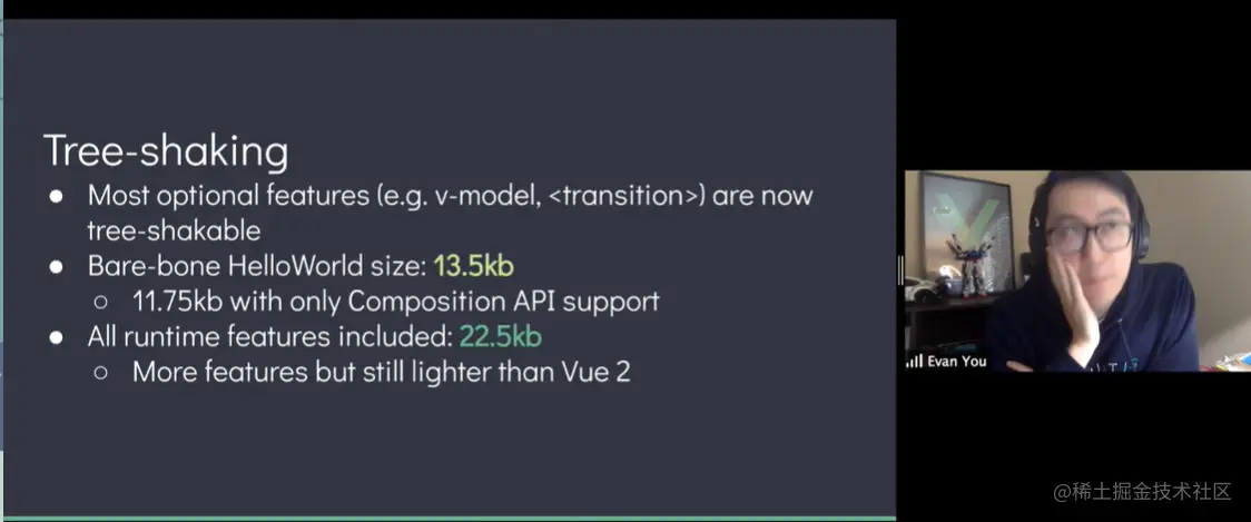 vue3支持tre-shaking,使得v-model,transtion等等函数支持tree-shaking。当然响应式相关部分和vdom更新算法不能加入tree-shaking,没有用到的一些函数代码的会被tree-shaked掉。后续可能会提供一个编译时开关,去掉对2.0语法的支持,做到更纯粹的渐进式。
