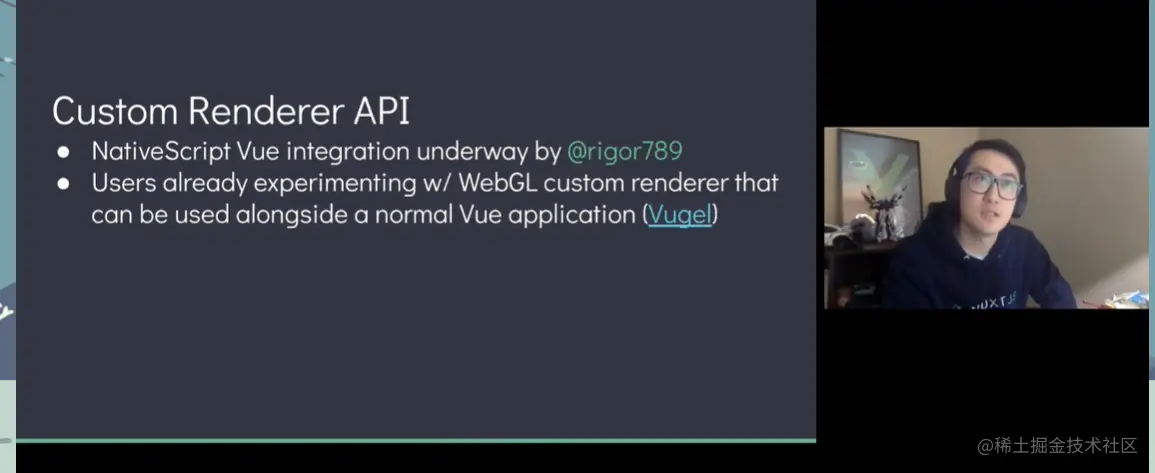 - 用户可以尝试WebGL自定义渲染器,与普通Vue应用程序一起使用(Vugel)。