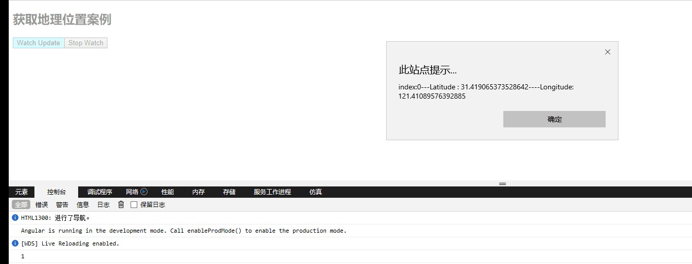 运行项目后,在 IE 浏览器中打开,谷歌浏览器暂不支持地理位置获取。点击页面中的第一个按钮,效果如下: