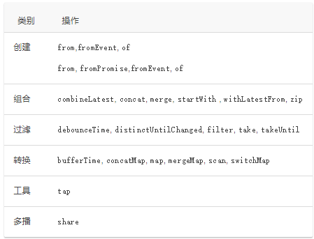 RxJS 中提供了很多操作符,用于创建 Observable 对象,常用的操作符如下: