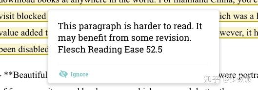 - Readability:由机器给文章的易读性打分。虽然软件会根据句子长度、复杂程度等进行打分,但尚不能为你提供具体的修改建议,只能建议你重新修改一下。如果在后续版本中,这一方面能够同样地给用户提出修改建议,那就更好了。