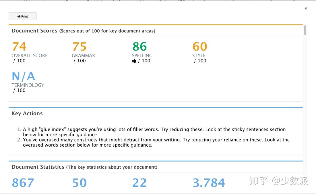 点击 Summary 即可生成 ProWritingAid 引以为傲的分析报告。在报告的开始,软件会和一位英语老师一样,对你在语法、拼写、风格、术语等方面打出分数,并随后在每个部分对问题提出分析和修改建议。在每个部分之后,还会和电脑开机软件一样,提示你在这一分项上打败了多少用户。