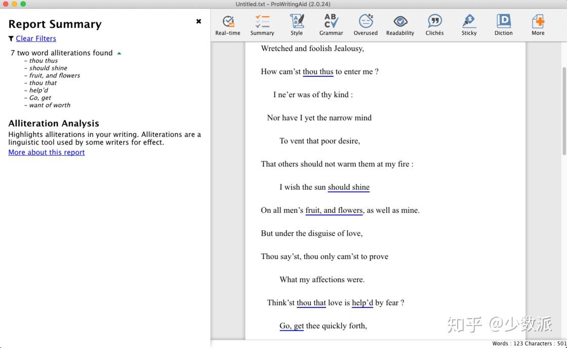 对于一般的用户而言,以上的功能已经可以帮助你解决80%以上的问题了。工具栏后半部分的功能更像是给专业作者的。比如 Alliteration,也就是「押头韵」。这种修辞手法通常会在演讲稿、诗歌等当中运用,通过韵律来形成节奏感,提高文章的可读性和感染力。点击后,软件会把文章中所有的「押头韵」都用下划线显示出来。