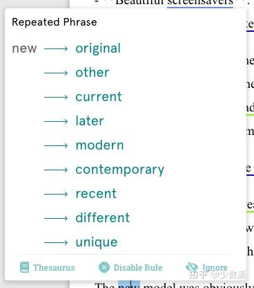 - All Repeats:我们写作的时候常常会有一些自己习惯使用的句型和词语。上学的时候,老师一直强调用用词的多样性。这个功能就是提醒你使用了多少单一的词语。这个功能也适合和 Thesaurus 一起使用。点击此功能后,鼠标移动到划线的词组上,软件会提示一系列同义词供你挑选。当然,自己在选的时候还需要做一下判断,ProWritingAid 提供的同义词有些并不适合语境,甚至会改变原有的意思。当你的文章中有许多专业名词的时候,它依旧会提示你重复了许多次,并希望你更换同义词。这时候,就只能选择性地忽略它「善意的提示」了。