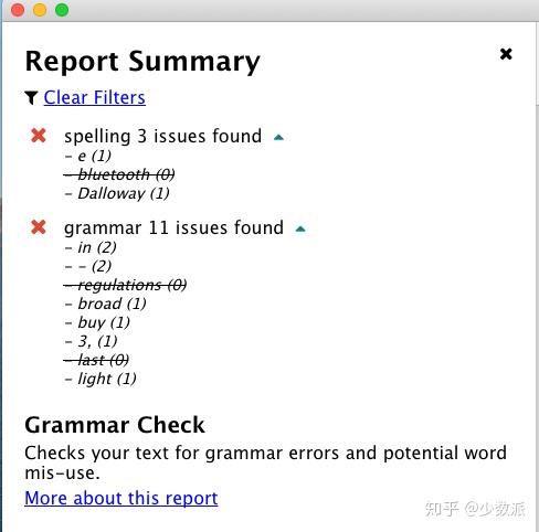- Grammar:主要显示的是拼写错误和语法搭配错误。这是我最常用的功能,当然也是在发布文章之前最应该修改的方面。每次更改之后,面板上的词语就会被划去,可以直观地知道自己改了什么。