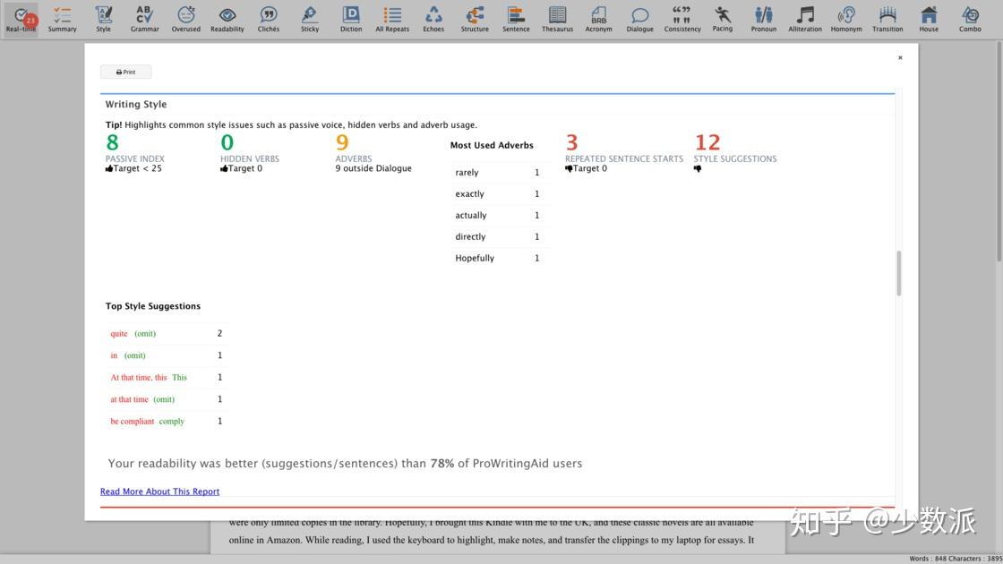 而反观 ProWritingAid,在语法上没有像 Grammarly 那样的检测强度,这让它并不会像上文 Grammarly 那样矫枉过正,但同时也会错过一些细小的语法问题。在其特色——文风上,它能够在用词、句型上提出不少有价值的建议,但同样有着太多自己的想法。比如说,学术写作非常讲究一层层逻辑的起承转合,而 ProWritingAid 却认为这些词语过于拖沓,经常建议我把逻辑联结词删去、改成主动语态。尽管文章的确会看起来更为简洁,但学术论文的逻辑性会大打折扣,教授也会皱起眉头。