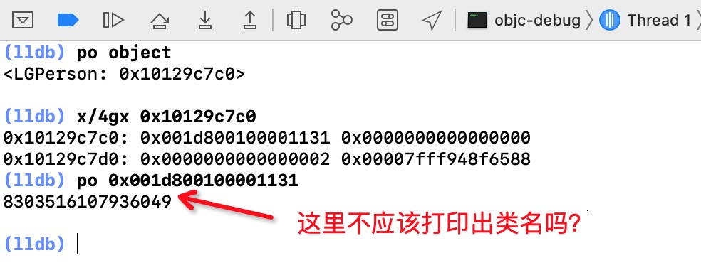 正常来说isa指向的就是该对象的类,那我们打印这个地址应该输出类名,但是出乎意料的是这里并没有打印出类名。
