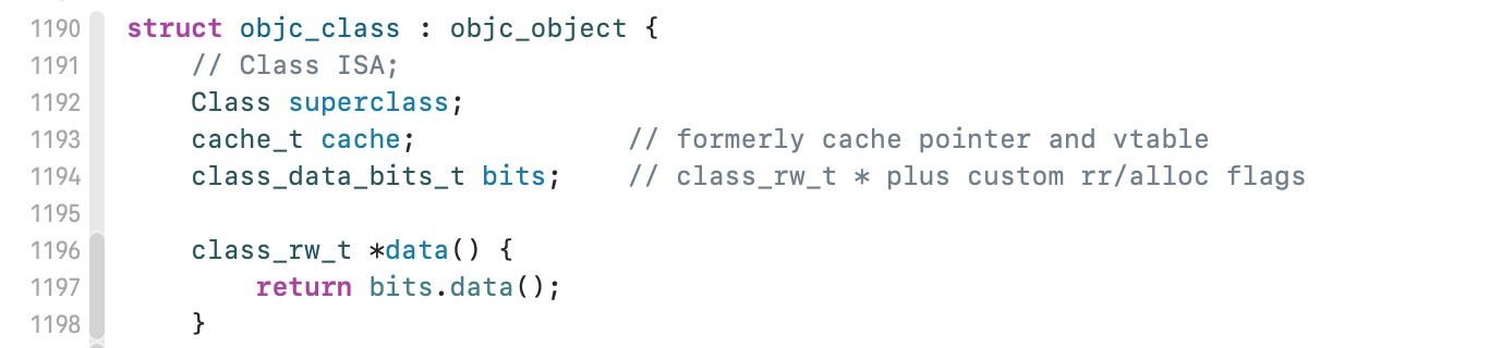 可以看到objc_class继承自objc_object,那么里面就应该有一个isa。此外还有的成员变量就是superclass、cache、bits、data。