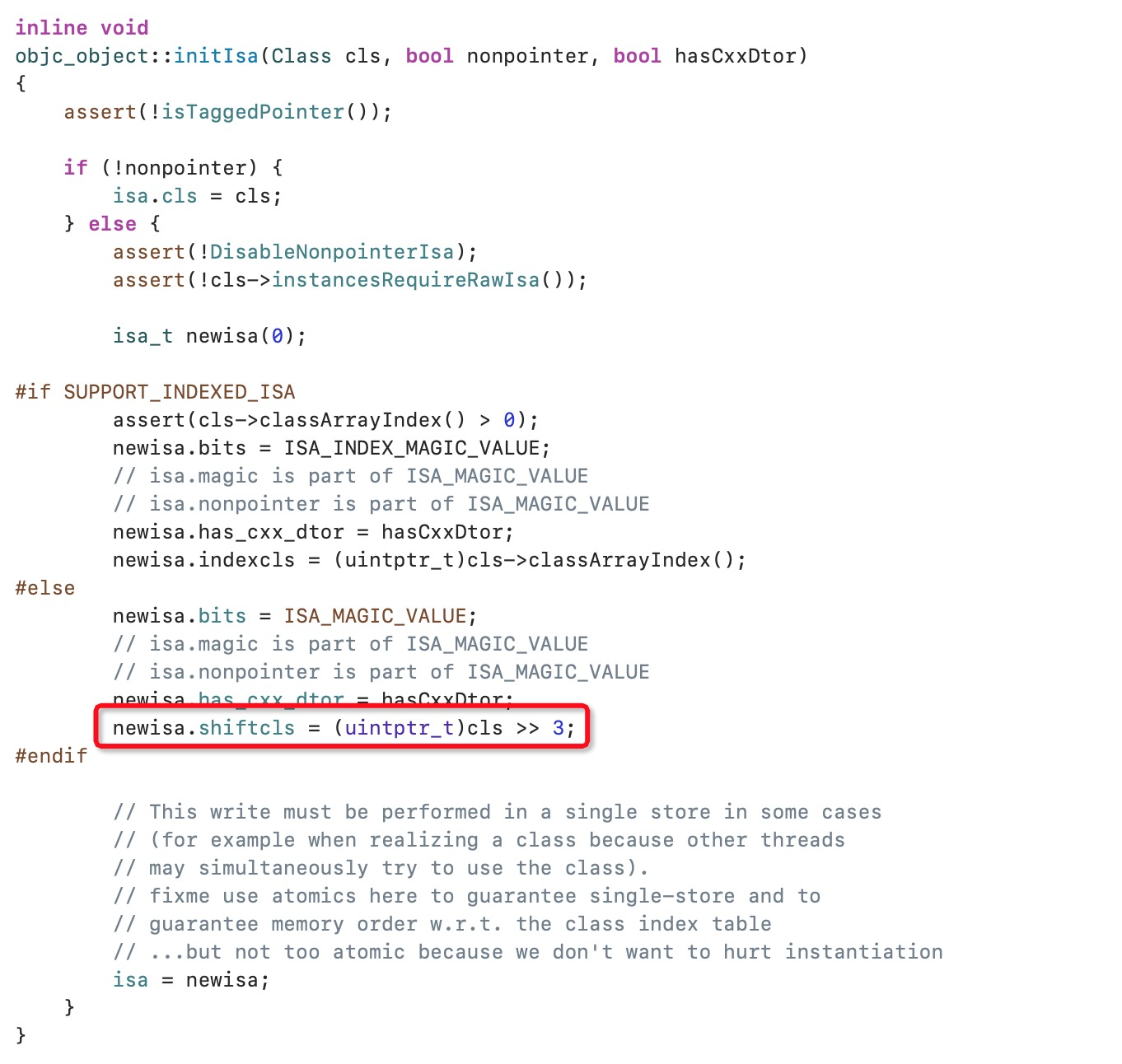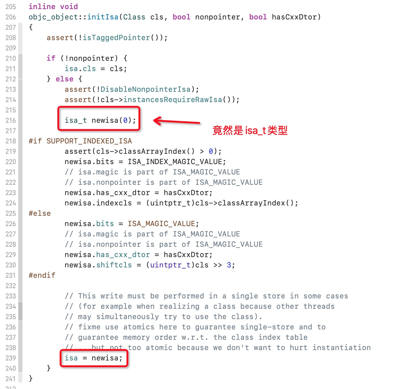 但是不行,这样也看不出来什么呀,还是不知道isa到底是什么。有看过 iOS alloc & init 方法解析 的朋友应该有印象,在alloc方法里面会调用一个叫initIsa()的方法,那么是不是可以在这个方法中找到isa的真正结构呢?