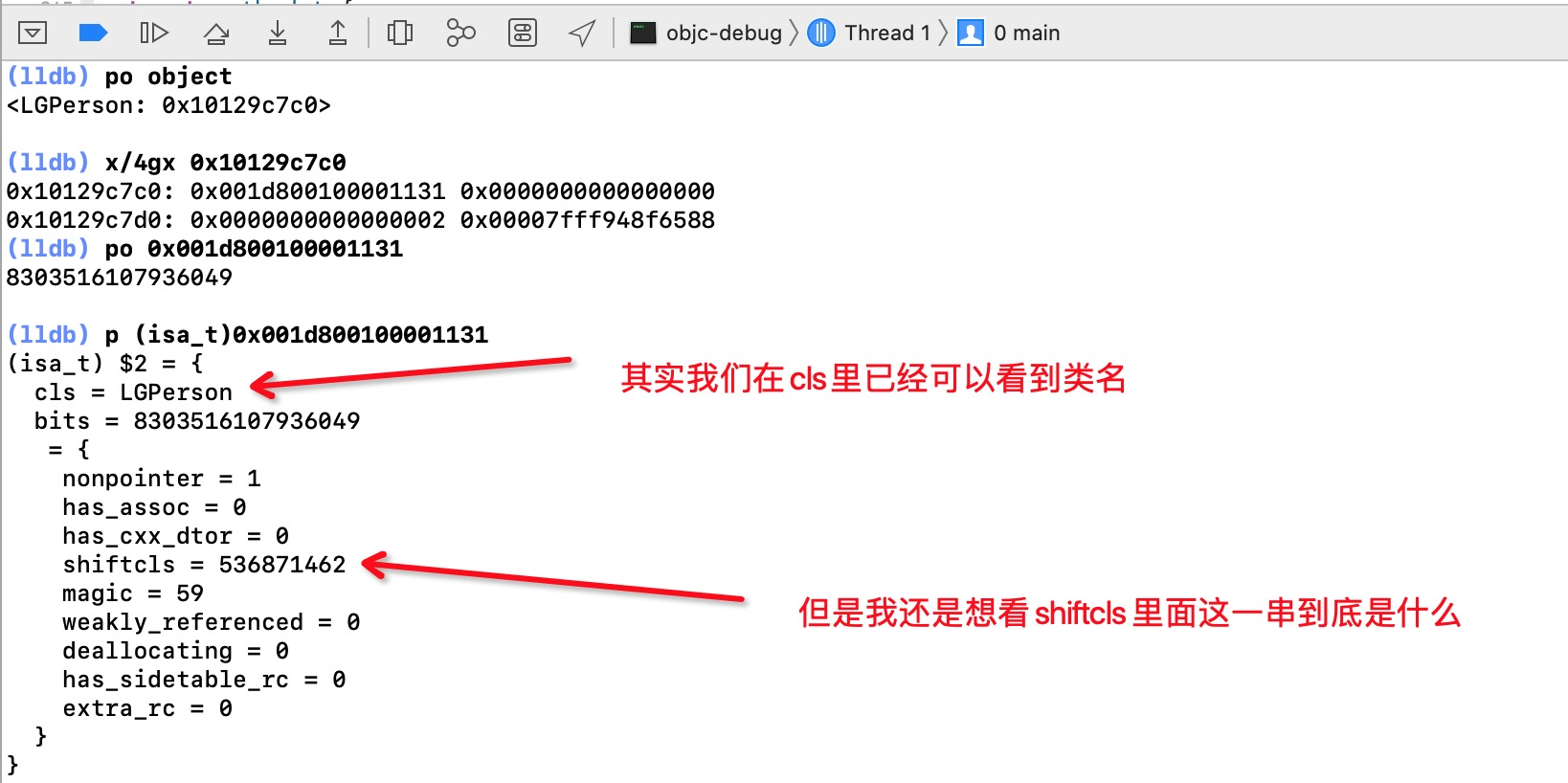 那么我们知道了,在开启isa优化的时候对象的指针是存在isa的shiftcls里面,那么怎么获得shiftcls呢?我们强转isa的类型为isa_t后打印