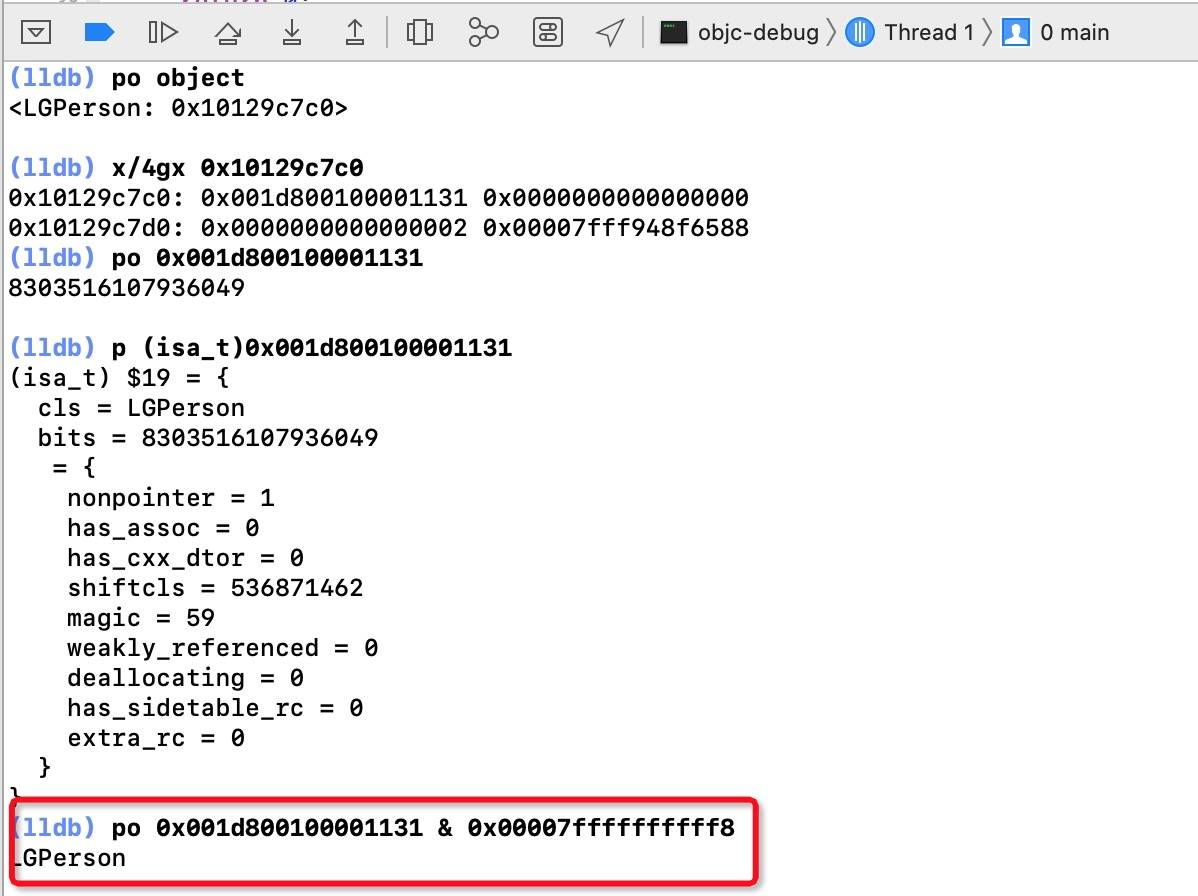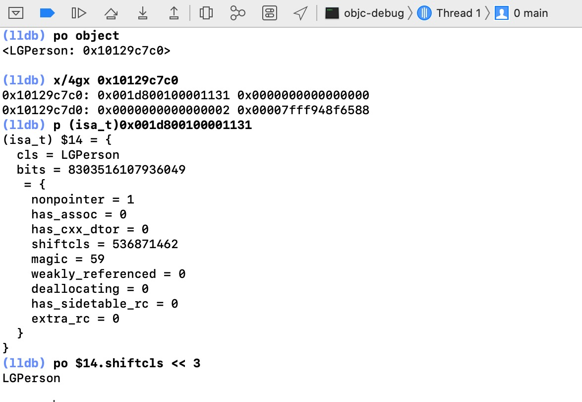 | nonpointer | 是否对isa指针开启指针优化0:纯 isa指针只包含类对象地址1: isa中包含了类对象地址、类信息、对象的引用计数等 |