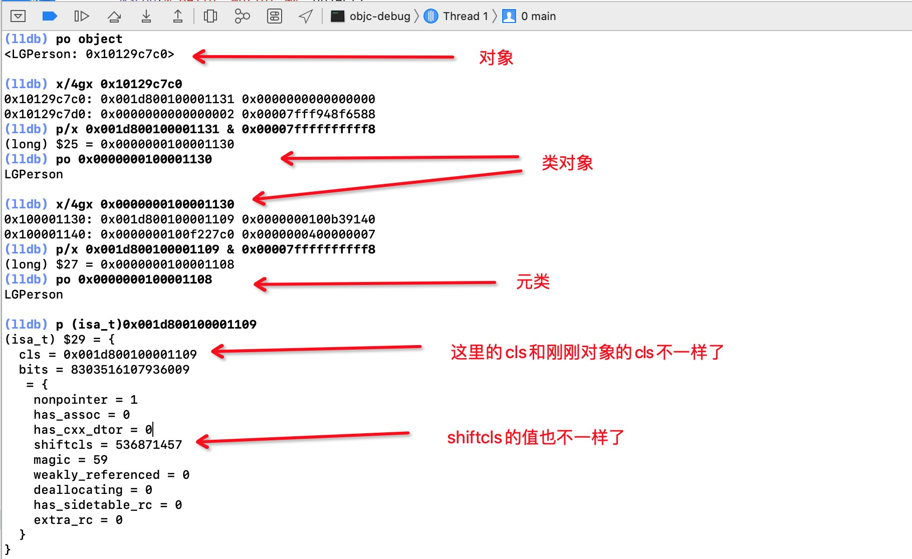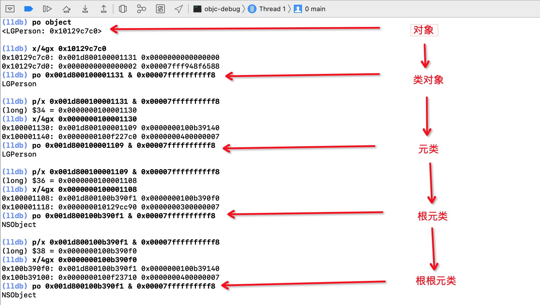 LGPerson,第一层是我们的对象,第二层是类对象。第三层虽然也是LGPerson,但是地址和第二层的不一样,说明不是同一个对象。类对象在内存中是只能存在一个的,那么第三层肯定就是元类了。 - 往上继续打印,发现元类对象