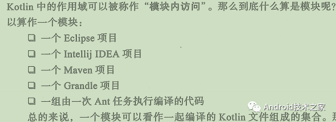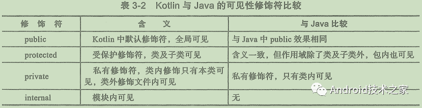 1、java中的默认修饰符是default,kotlin中的默认修饰符是public2、java中只允许内部类用private修饰,而kotlin都可以3、kotlin有internal修饰符,模块内访问,4、protected 在java允许包、类、子类可以访问,在kotlin只允许类及子类可以访问。