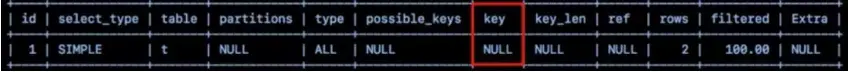 explain select * from t where id=2;的KEY结果是PRIMARY,就是我们常说的使用了主键索引