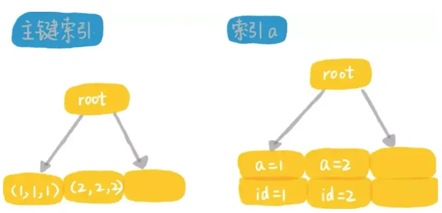 该表有三个字段,其中用id是主键索引,a是普通索引。