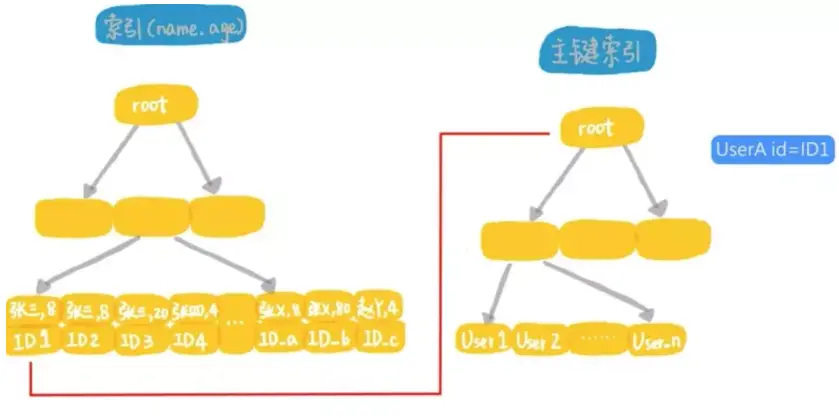 - 首先从联合索引上找到第1个年龄字段是张开头的记录,取出主键id,然后到主键索引树上,根据id取出整行的值;