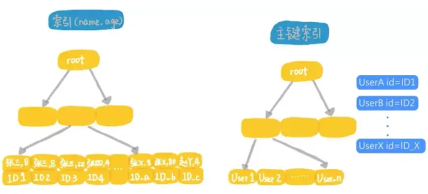 我们都知道,InnoDB是索引组织表,所有的数据都是存储在索引树上面的。比如上面的表t,这个表包含了两个索引,一个主键索引和一个普通索引。在InnoDB里,数据是放在主键索引里的。如图所示: