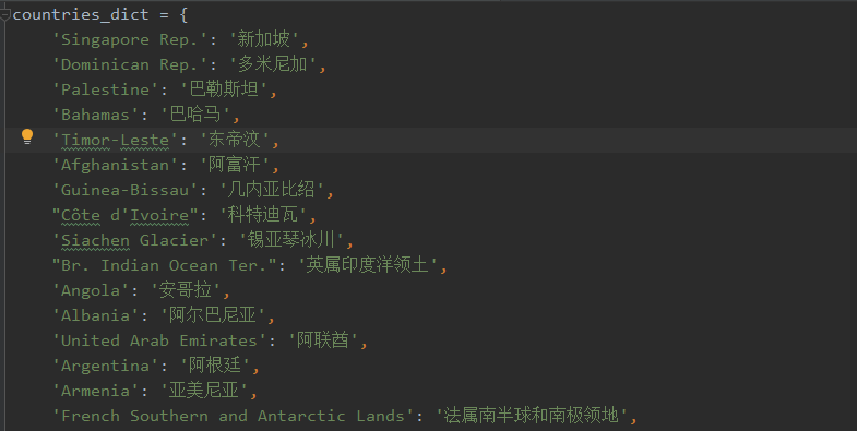 网上能找到这样的对应关系,但想要用起来还需要解决两个问题。第一,两边中文名统一,比如:我们收集的国家名是中非共和国,而对应关系里是中非,那还是对应不上。第二,需要自己增加映射关系,网上找的一般都不全,我们需要根据收集的数据自行增加。经过上面两个步骤处理后,我们就可以将大部分国家名对应到pyechars能识别的英文名了。相关代码如下