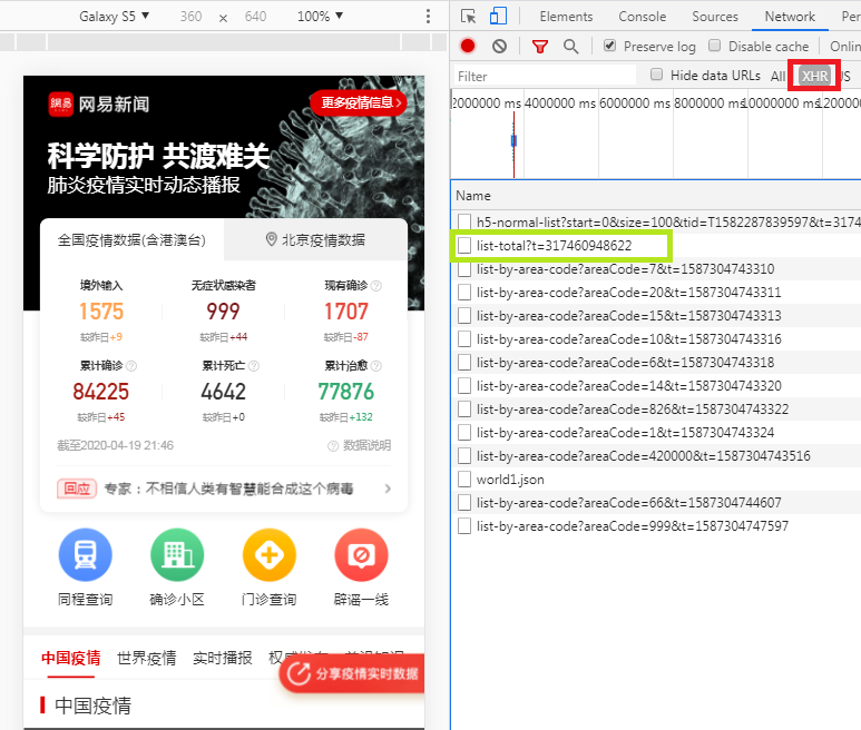 我们选择 XHR,重新刷新下网页可以看到有几个接口,其中 list-total 接口是获取当前所有有疫情的国家,以及对应的国家id。另外,我们看到还有一个 list-by-area-code 接口,它是获取每个国家历史上每天的疫情数据,请求这个接口需要带 areaCode 参数,这个参数就是我们刚刚说的国家id。所以对我们来说这两个接口是最重要的。下面我们就看看请求 list-total 接口的代码