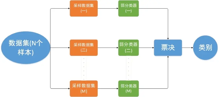 票选:M个分类器会得到M个分类结果,所以最后通过投票将分类结果中最多的类别作为最终的分类结果。