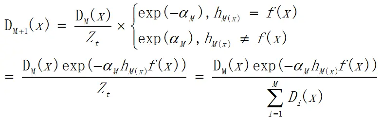 在下次训练之前,为了使正确分类的样本权重降低而错分样本的权重提高,需要对权重向量D更新:
