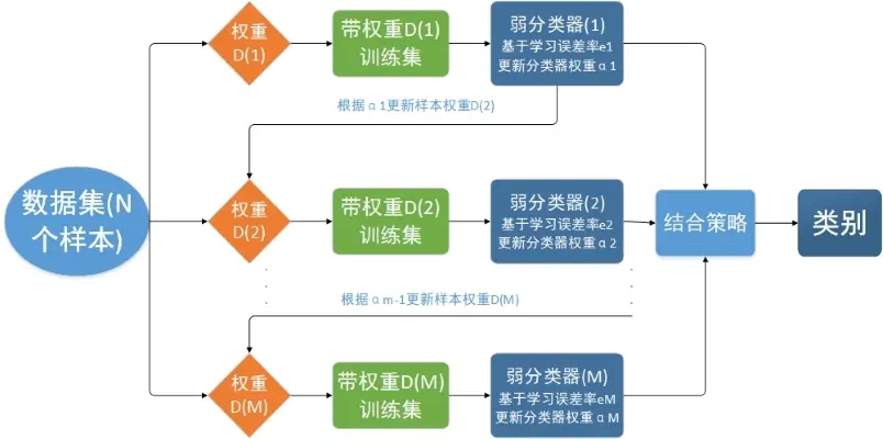 在决定最终的分类时,由于每一轮分类权重都会发生改变,所以Boosting方法通过加权求和的方式得到分类结果。Boosting方法的典型代表为Adaboost,它是由很多棵决策树与Boosting方法思想相结合而成,也被称作提升树,除此之外还有GBDT和XGBoost。下文会给出以AdaBoost的流程图,其原理就是Boosting的主要思想。