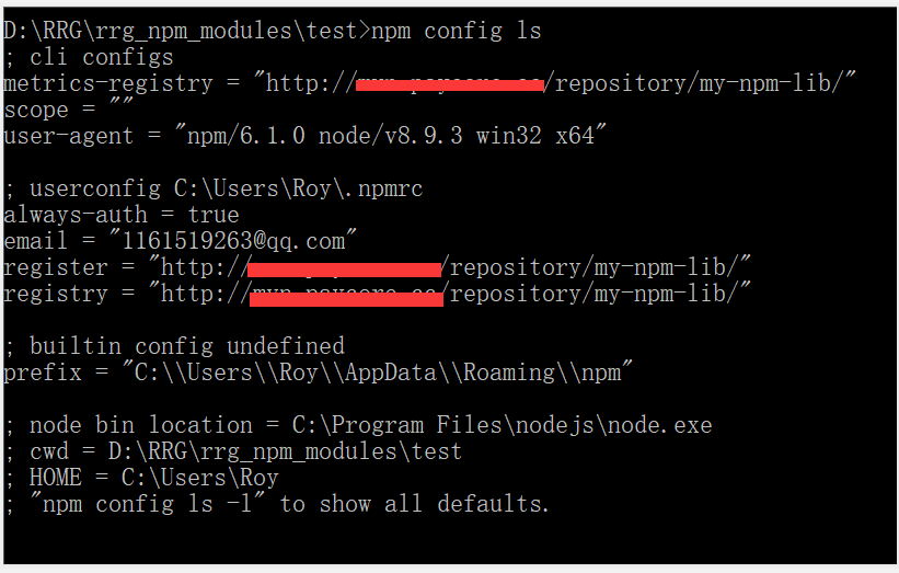 接着使用使用npm config ls查看npm的配置