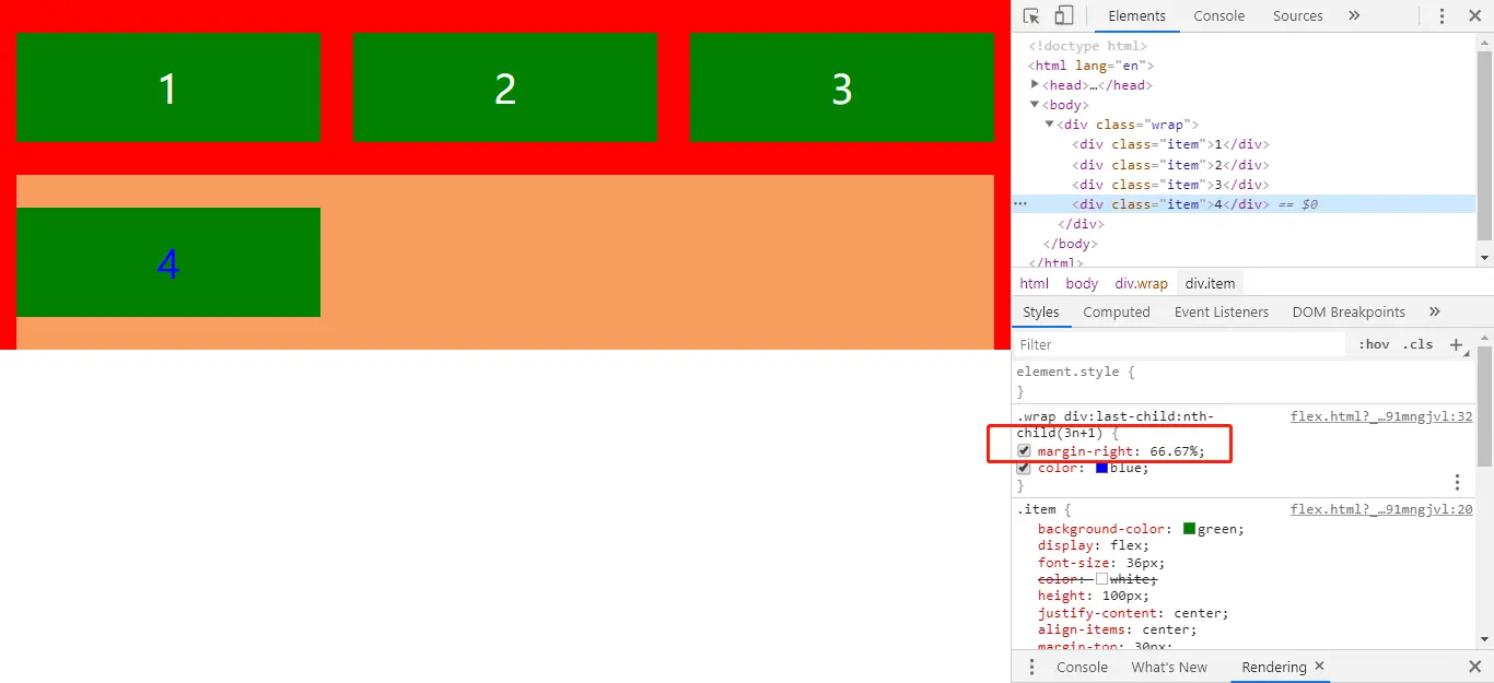 每个小块宽度是 30%,然后每个小块左右两边会有 10/6 的间隙。那么4号元素距离右边应该是: 30*2 + 4*(10/6) = 66.67