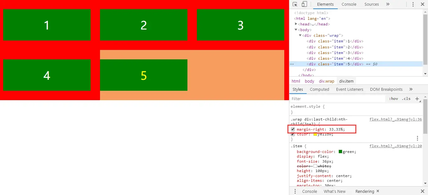 每个小块宽度是 30%,然后每个小块左右两边会有 10/6 的间隙。那么5号元素距离右边应该是: 30*1 + 2*(10/6) = 33.33